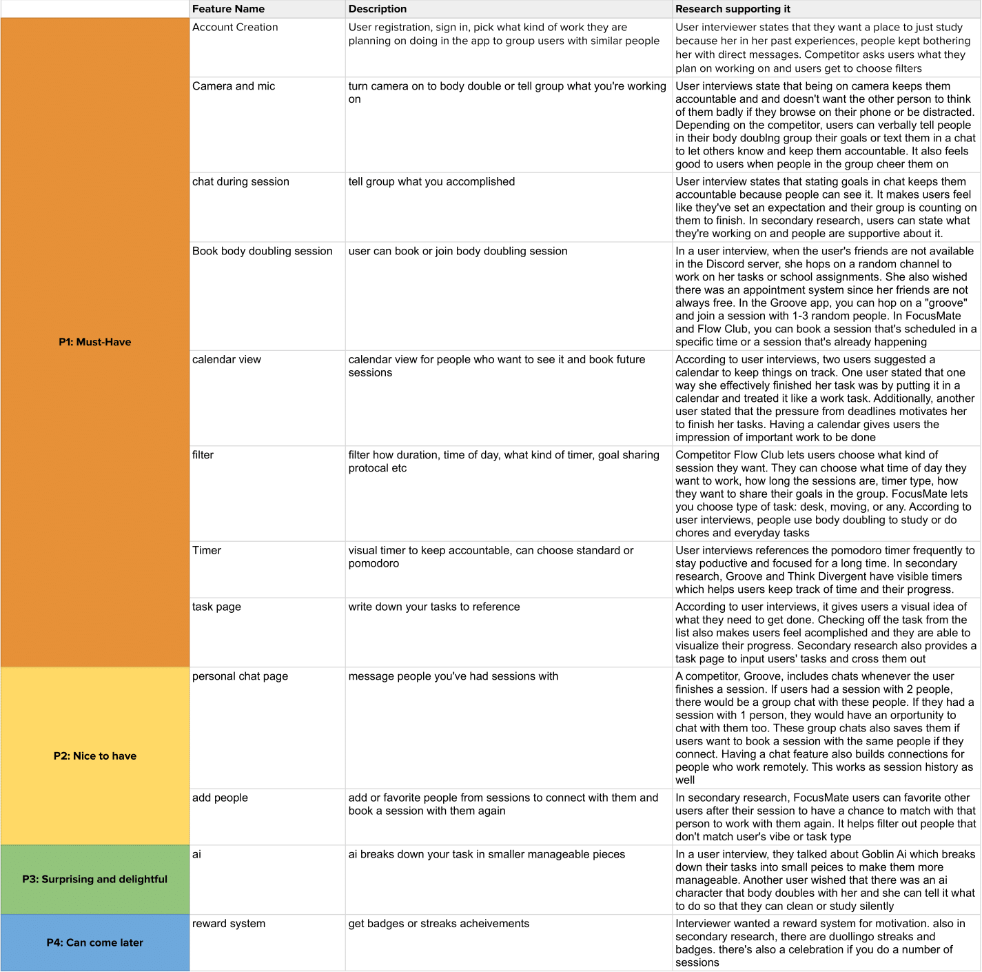 I'm using the design framework to understand users who body double, define the problem, and design the solution.