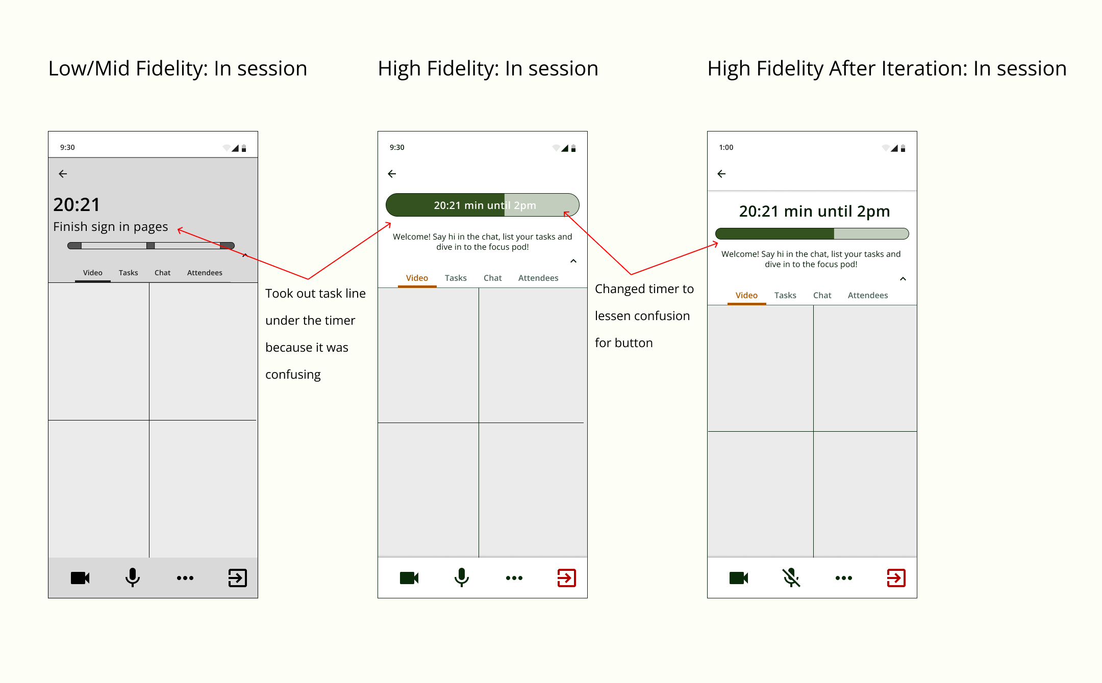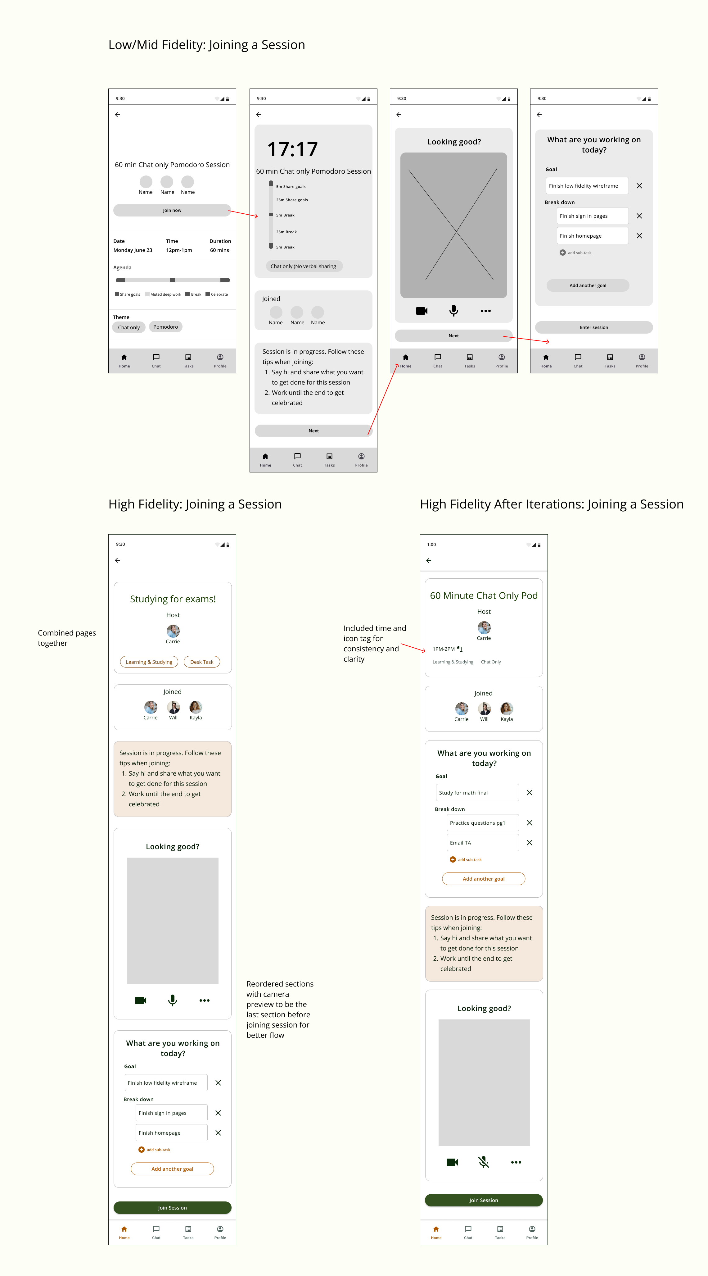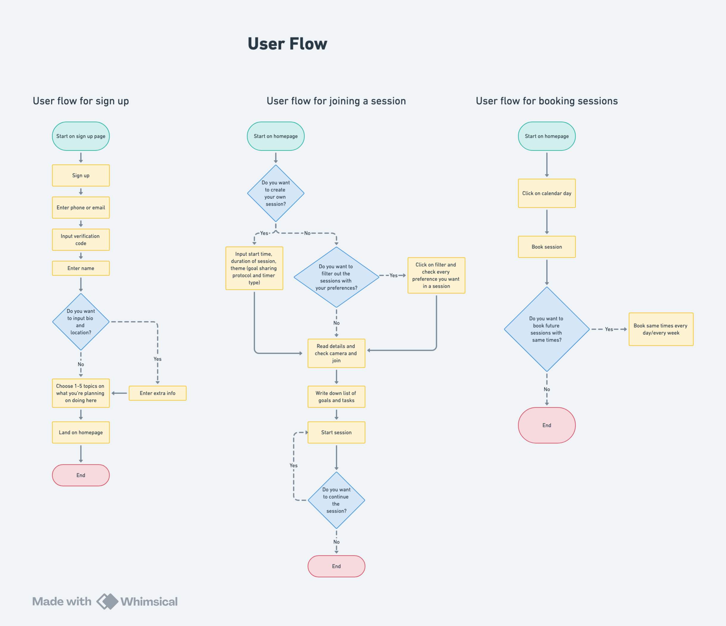 Based on interviews, users who procrastinate work best with people with similar goals and with the thought of an important deadline. FocusPod offers filters to help users find the best session and a way to book future sessions to build a routine.