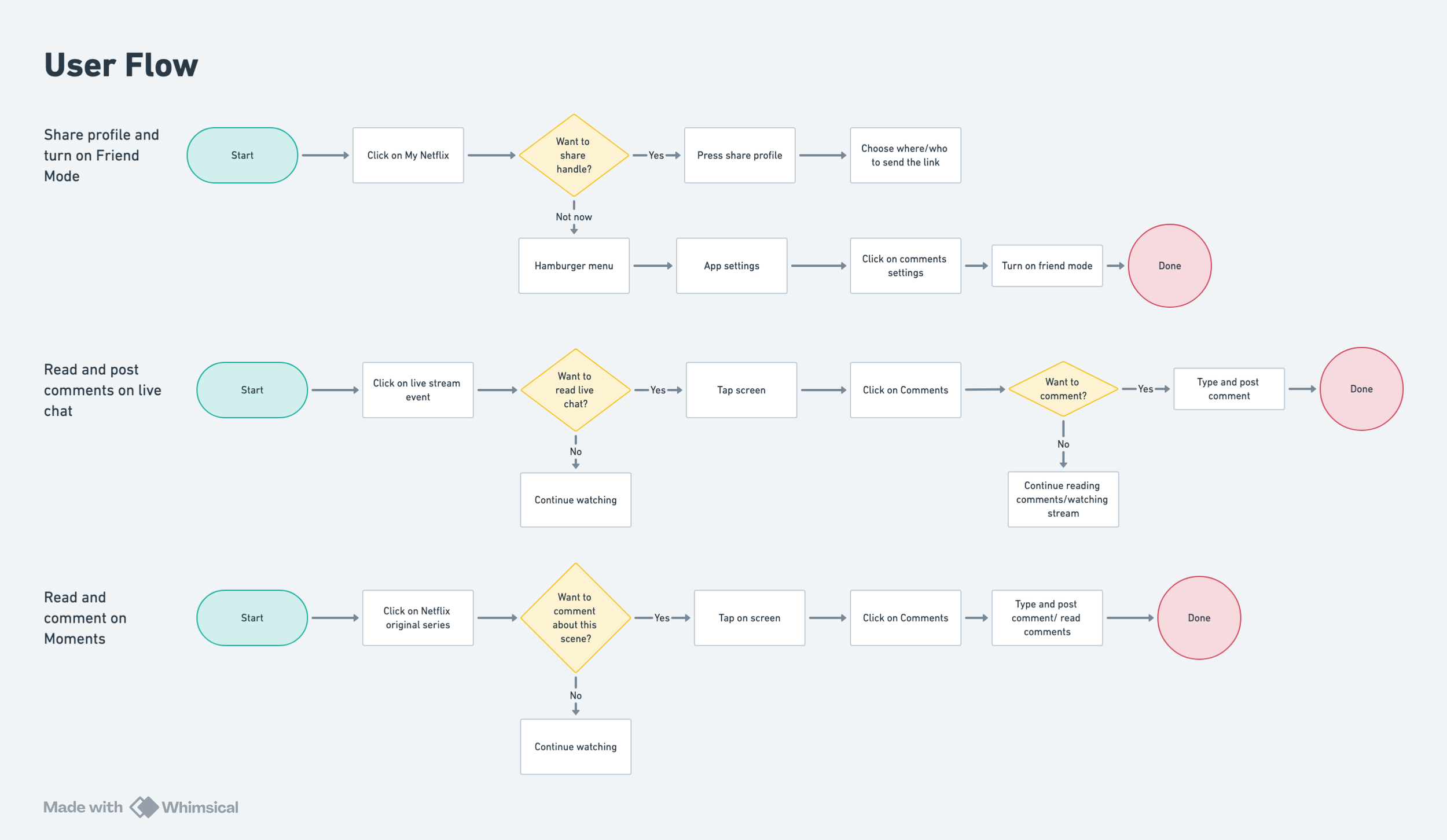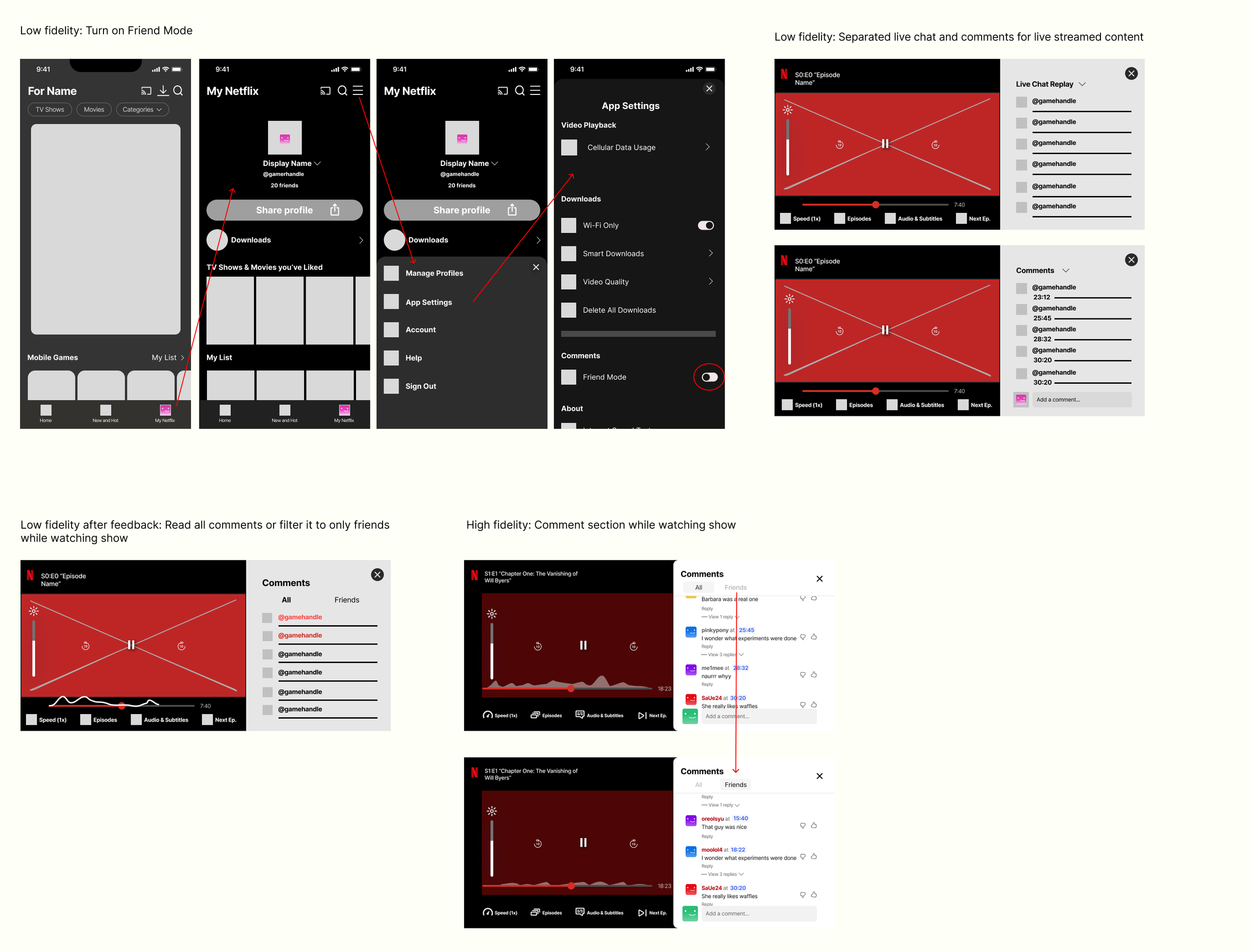 After finishing the low-fidelity wireframe and testing it with users, I decided to add a new section for comments instead of implementing it into “Moments”, an existing feature from the Netflix app. With mentor and user feedback, I also took out “Friend Mode” from the app settings and allowed users to filter their comment section while watching their show or movie.