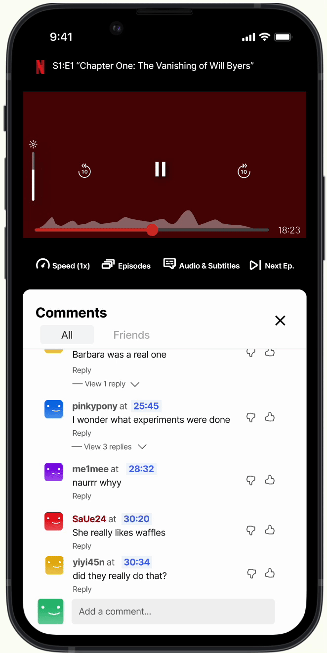 This project adds a social feature, allowing users to comment and read comments while watching original Netflix content. The feature varies from reading comments from the public Netflix community to mutual friends.