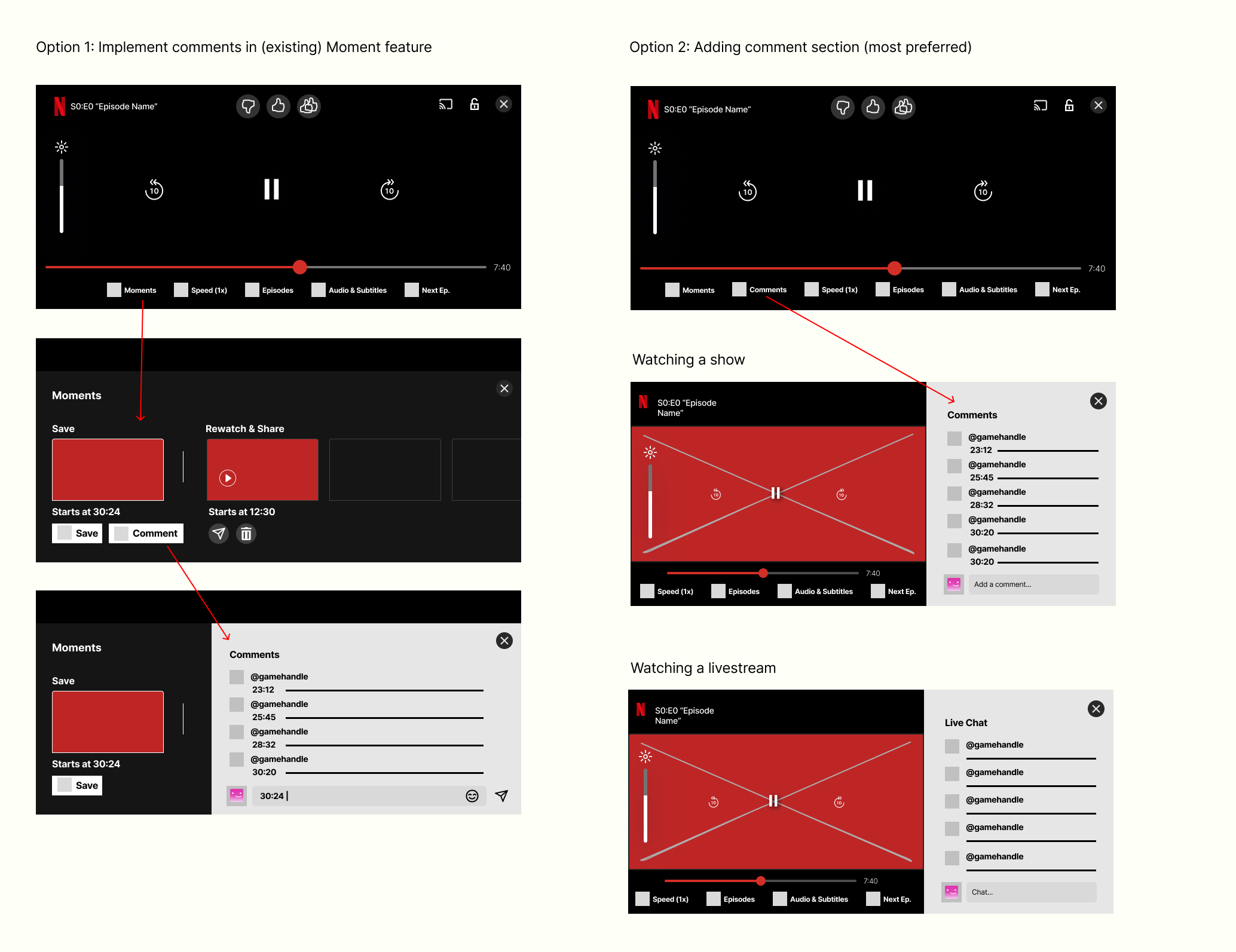 Proposed solution: I combined the comment section for live chats and comments because there wouldn’t be a difference if it’s timestamped comments