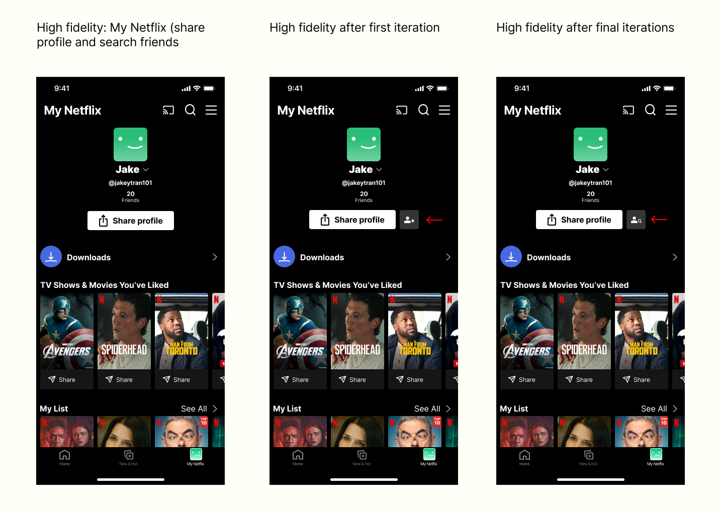 One challenge was designing the high-fidelity wireframe because I had to figure out the best way to “add friends” on the Netflix app without losing focus on the user goal